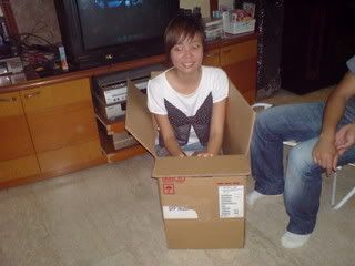 met up wif laopos n gang ystd! da laopo power sia! one sms, full attendance!!! below is a pic of her.. hiding in the box coz scared of dogs.. we entered the house hor.. she super xiao nv ren... hide behind me cried coz of boy boy n dou dou.... den hid in the cardbox the WHOLE nite.... and we had so much fun last nite! played wine games n polka cards till we finally finished tt bottle of chivas which had been collecting dust at seah yankar's hse! the last time was kaili's bday! muz hv such gathering again real soon!!!!!! Y LAST NITE NO PHOTOS LAOPO! and let's get together again real soon! n n n xiaolaopo, u REALLY useless.